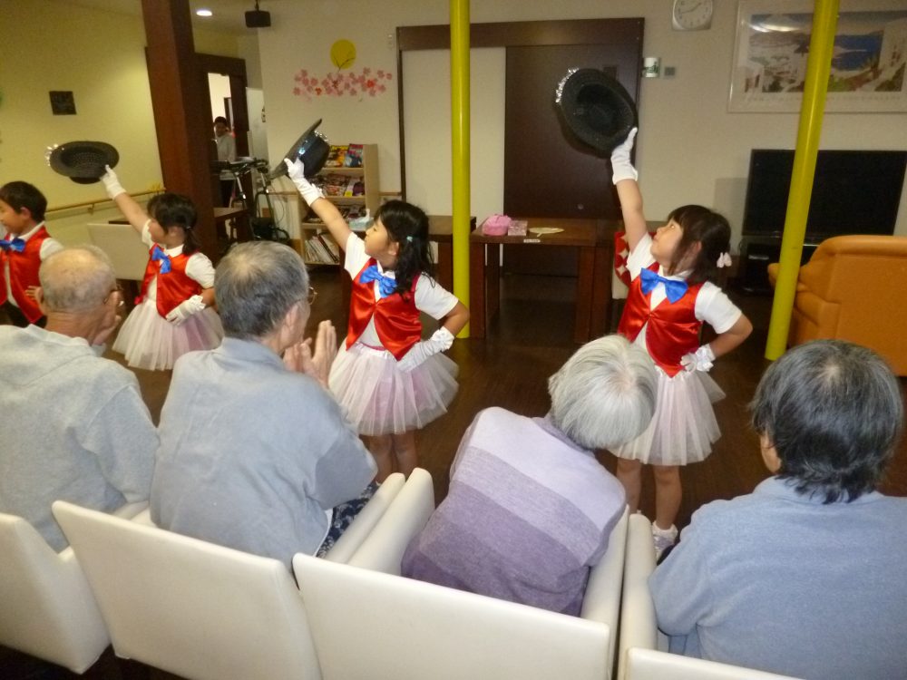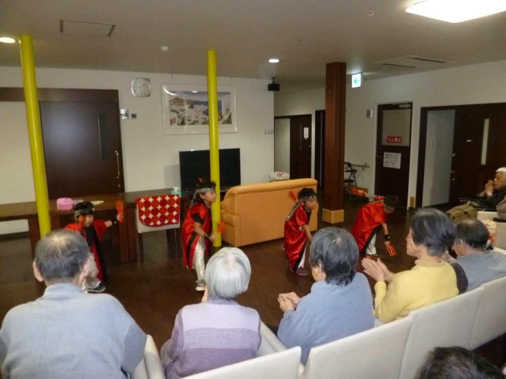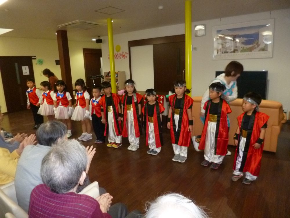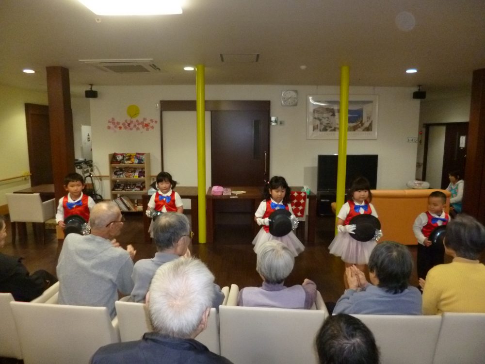 2019.11.30 ハートリンク岩国柱野 可愛らしい訪問者 11月27日に可愛らしい訪問者が現れました♪ 周東幼稚園 の 年長組 の12名です(*´▽`*) 昼食の時間に、入居者にお伝えしたところ・・・ すぐに席の場所取りをされておられる方がいらっしゃいました(*´▽`*) 素敵なダンスと歌を披露してくださいました。 とても上手で可愛らしく大喜びでした(*´▽`*) 最後にお礼のプレゼントを入居者よりさせて頂きました。 どの入居者も手渡ししたく、争奪戦になっていました。 是非、また遊びに来てください(*´▽`*) 一覧ページに戻る