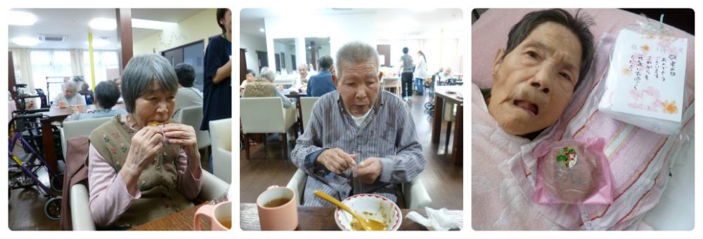 2019.10.02 ハートリンク岩国柱野 敬老の日 9月15日にお祝いをしました。 おやつにどら焼きをみんなで食べました。 スタッフ一同より、ささやかなプレゼントもあったのですが、 皆さん、どら焼きに夢中になっておられました(*´▽`*) おやつ後、プレゼントを開けて喜んでおられました(*´▽`*) 敬老の日、おめでとうございます(^▽^) これからも、一緒に元気に楽しく過ごしていきましょう♪ 一覧ページに戻る