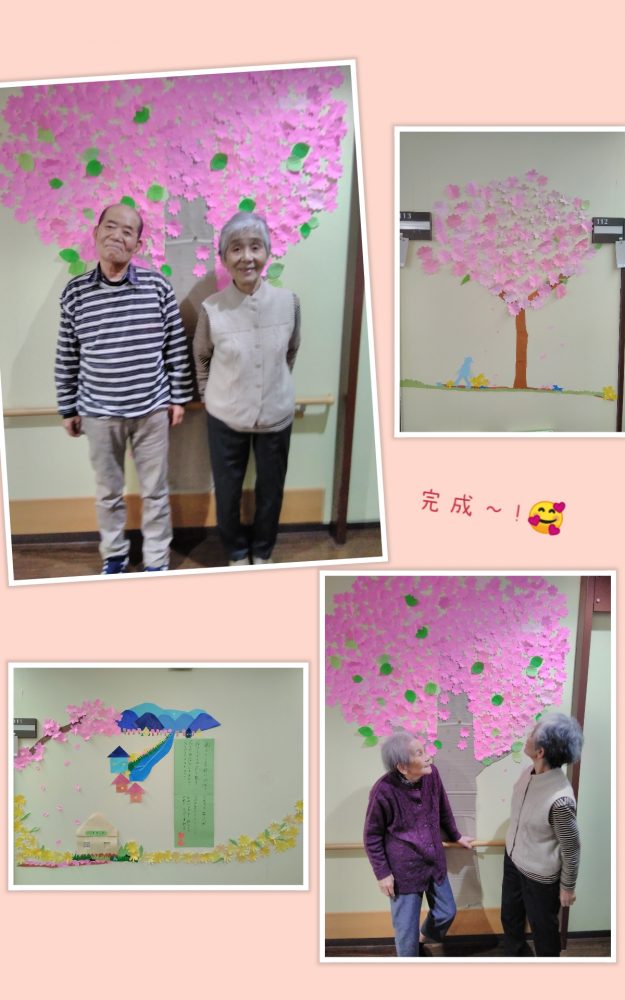 2月中旬ごろから、コツコツと…入居者様と作り始めた壁画が完成‼ヽ(^o^)丿