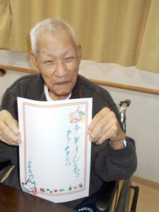 本日は、入居者さんと新年の抱負を書き、芋ぜんざいを頂き、