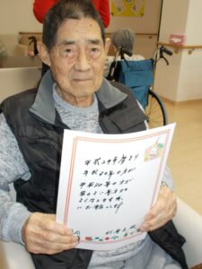 本日は、入居者さんと新年の抱負を書き、芋ぜんざいを頂き、