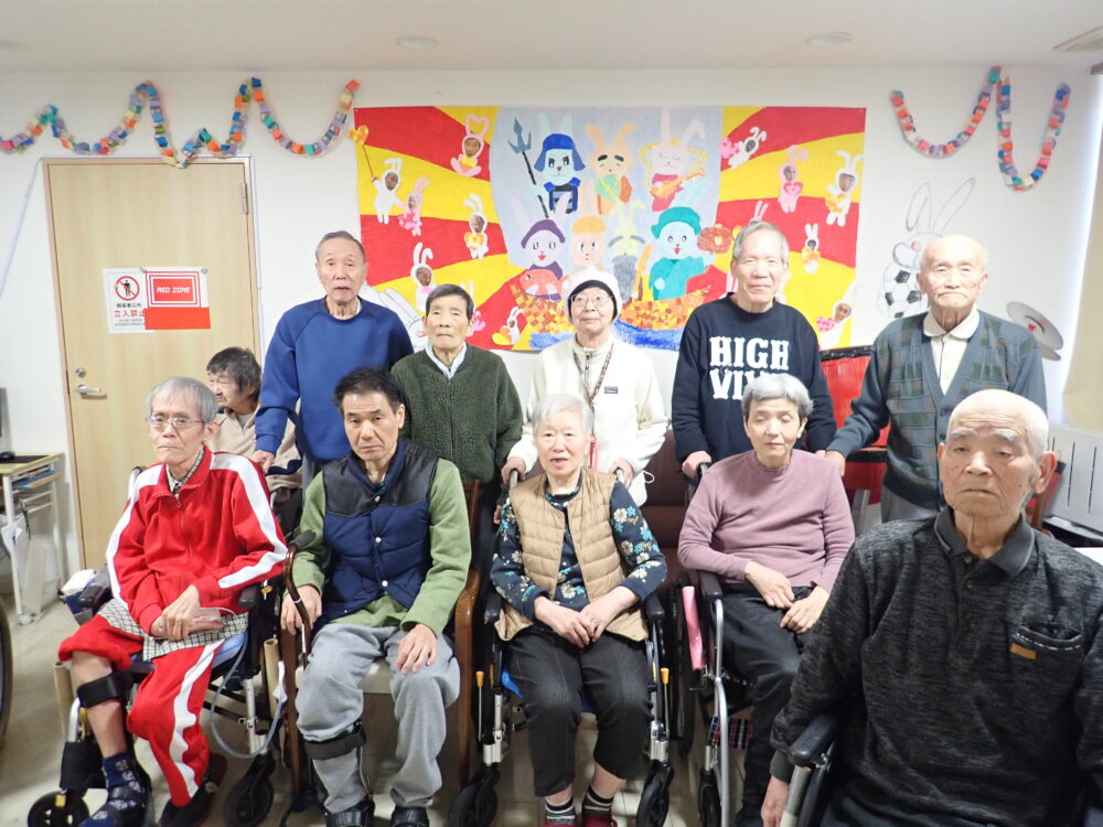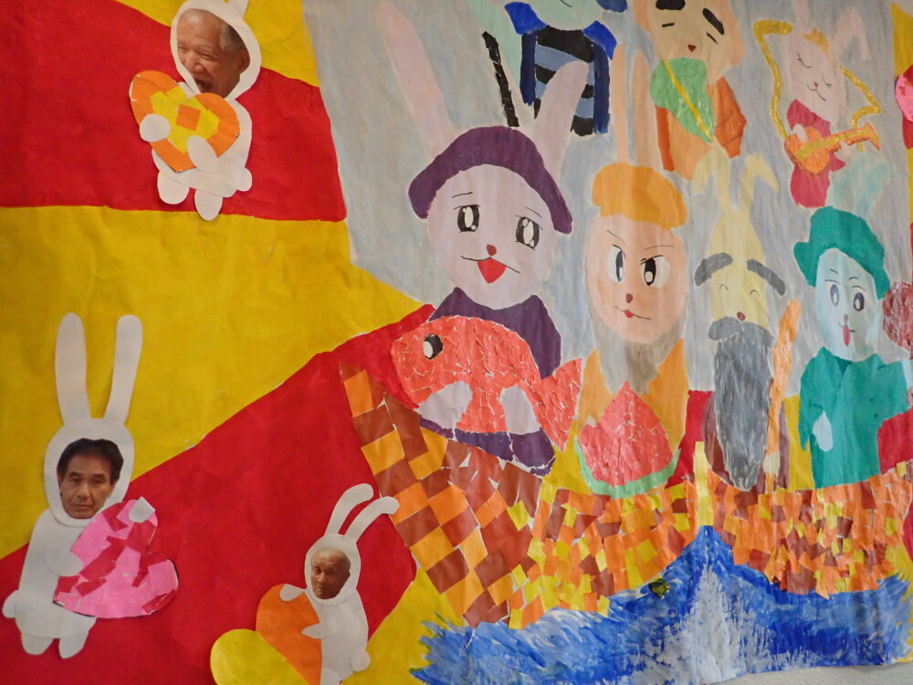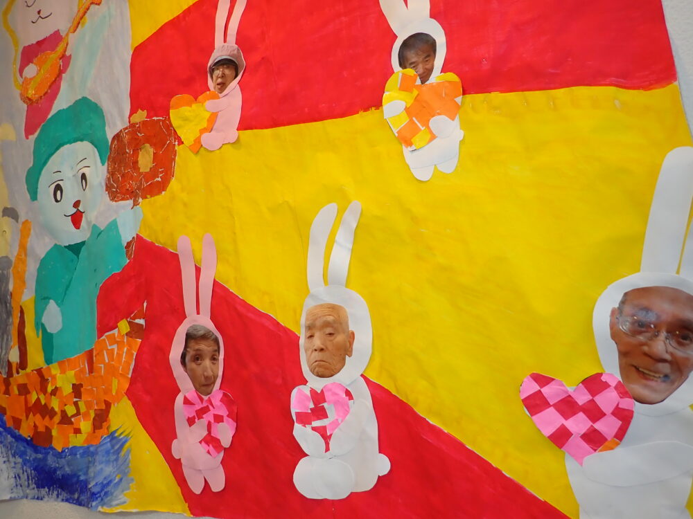 周りのうさぎが利用者様のお顔でみんな違うポーズのうさぎで