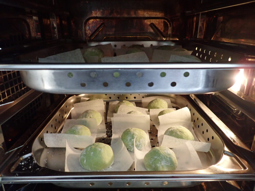 よもぎを混ぜた生地であんこを包んで完成です🙌