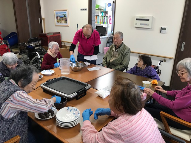 入居者様の一人が監督となり他の入居者様へあんこを丸めるのを教えています(^^♪数も計算しながらあんこ球を作ってくれてます。