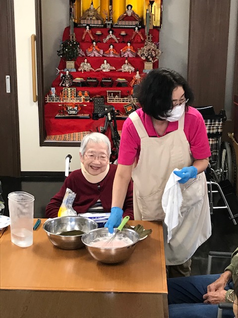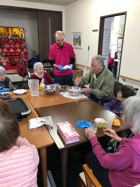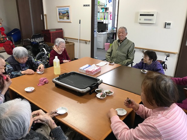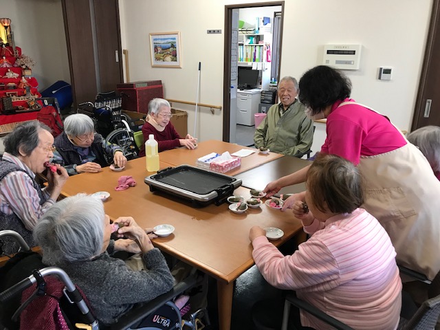 お茶が来るまで待てませ~ん(笑)すでに食べ始めています。その後、お茶を飲みながらスタッフと一緒に美味しいねと拍手でひな祭り手作りおやつは終了しました~~(^_-)-☆私も入居者様とスタッフと一緒に「焼き担当」で楽しめました。ご協力頂いた方々へ感謝の気持ちでいっぱいです。ありがとうございました。
