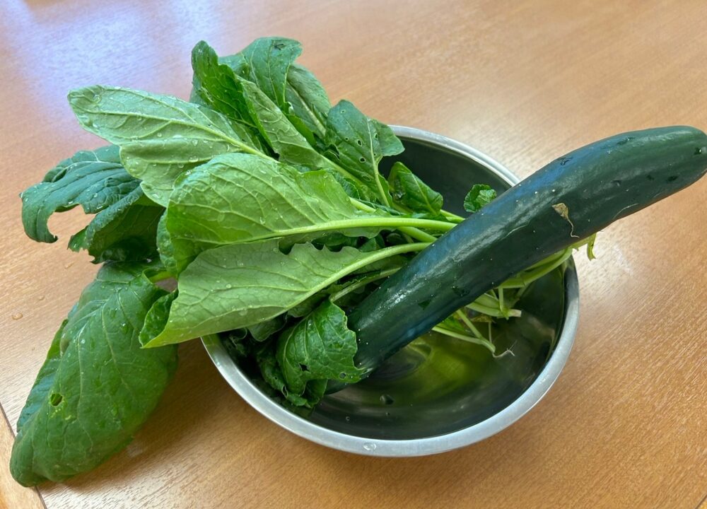 小松菜はお味噌汁の具材に、きゅうりは朝食にお出しし