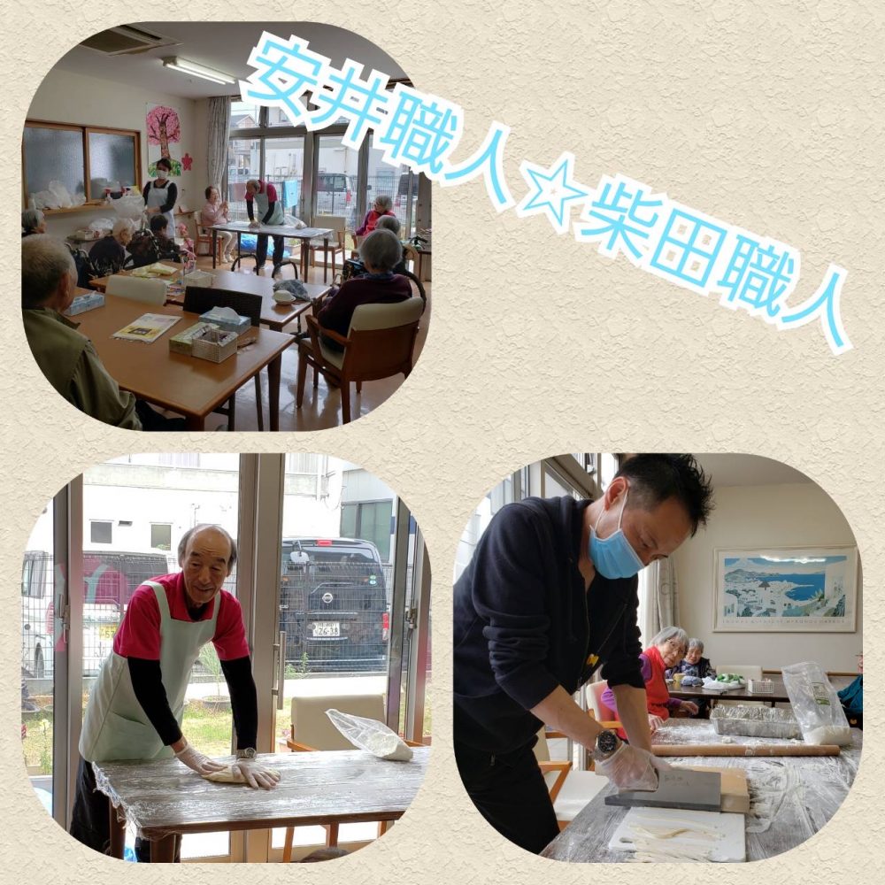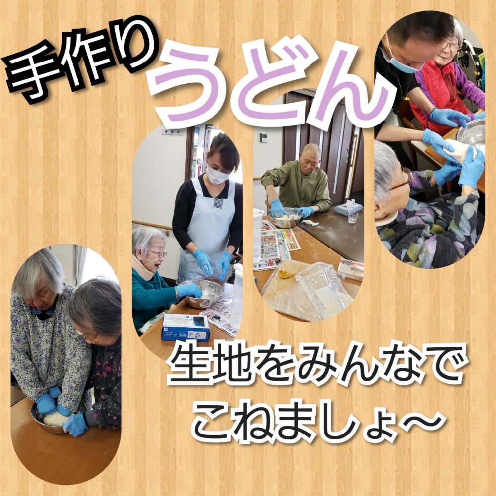事故の無いように職員が見守り、支えながら一生懸命うどん生地を完成させていきます