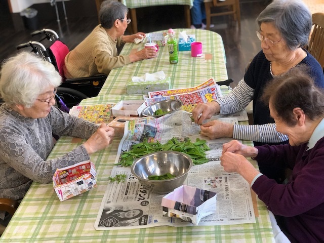 食後の空いた時間には、エンドウ豆の筋を取ってくれました。