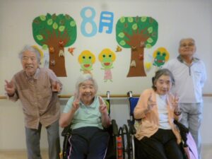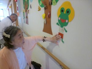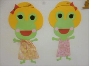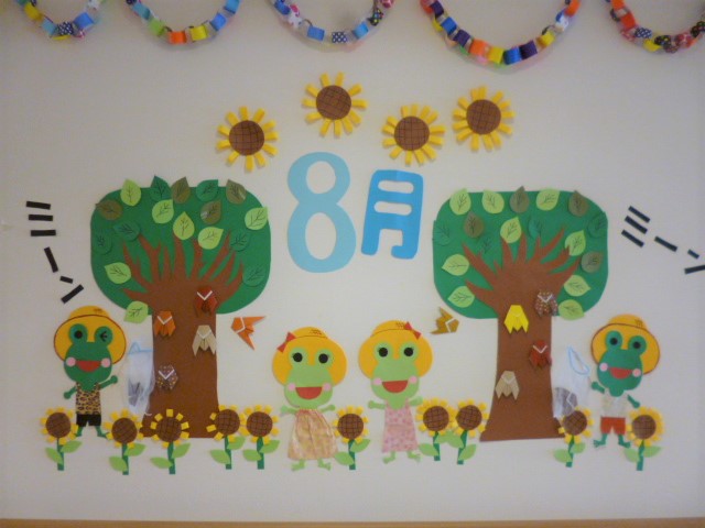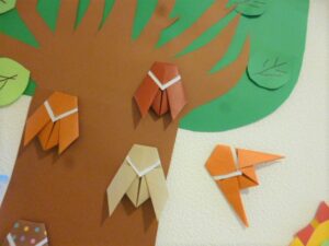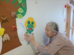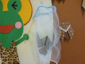 折り紙でセミを折って頂き、カエルちゃんには布でお洋服を💛