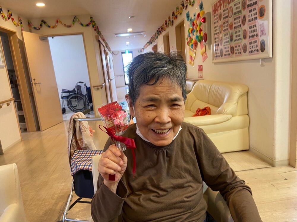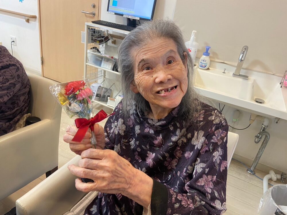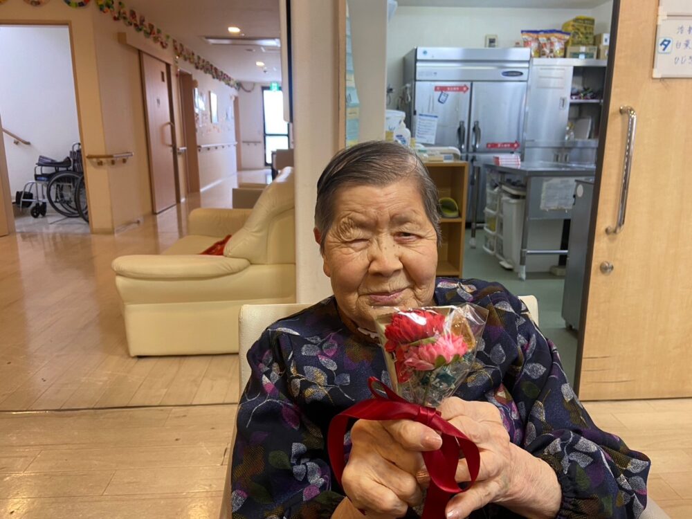 職員手作りのカーネーションのミニ花束を