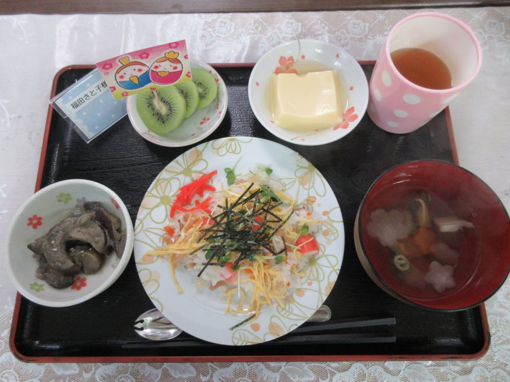 ・具だくさんちらしすし ・ナスの味噌炒め ・卵豆腐 ・野菜しる ・キュウイ