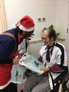 会の最後に職員サンタが皆さんにプレゼントを渡し、そのあとケーキを食べました。