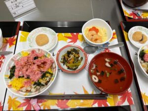 ネギトロと、茶わん蒸し、梨や桃など新鮮なフルーツ