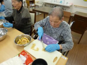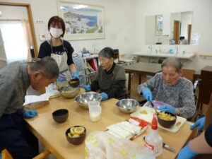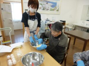 まずはカップケーキの生地を作ります。入居者様も一緒に参加してくれます。