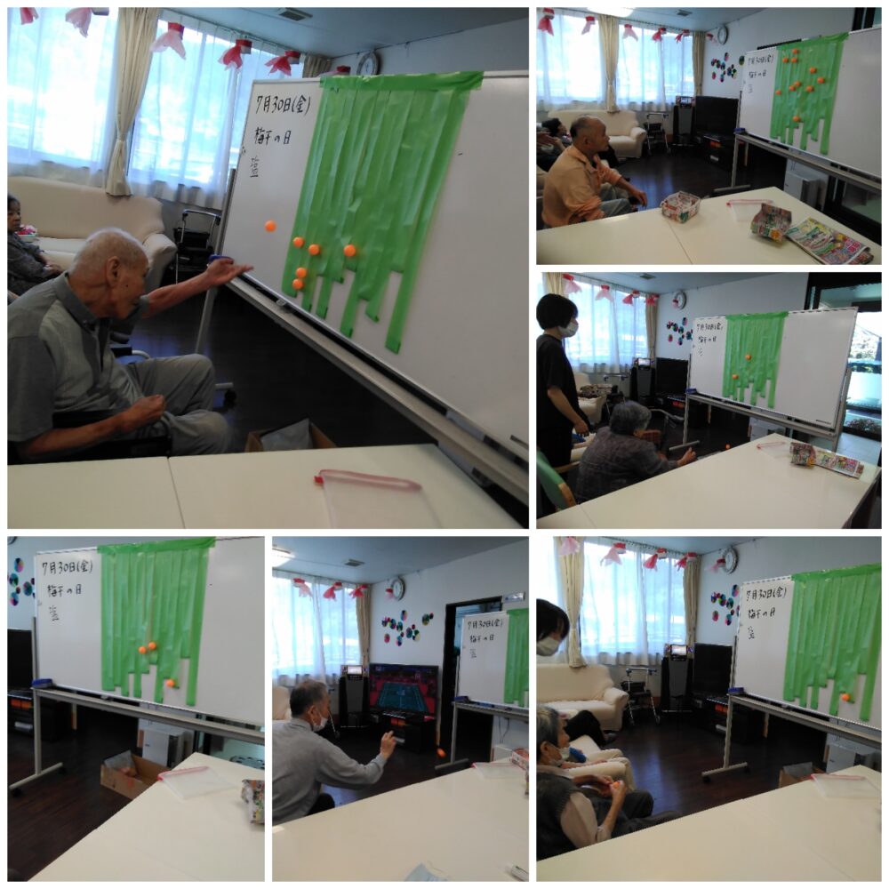 ホワイトボードに長さの違う養生テープを貼り付け、そこに向かってピンポン玉を投げて、何個くっつけることができるかというもの。