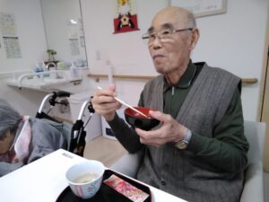 作業後にはスタッフ手作りの豆腐を団子風にして作ったぜんざいを食べて頂きました。