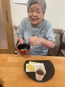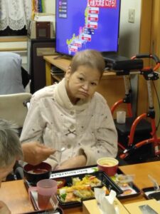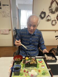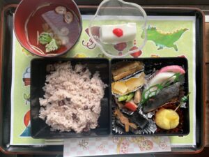 昼食は、重箱に入ったおせち料理とお赤飯。すまし汁に牛乳プリンのデザートです