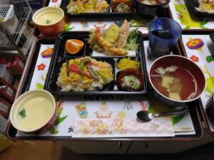 夕食は、ちらし寿司に天ぷら盛り合わせ、茶碗蒸しです。