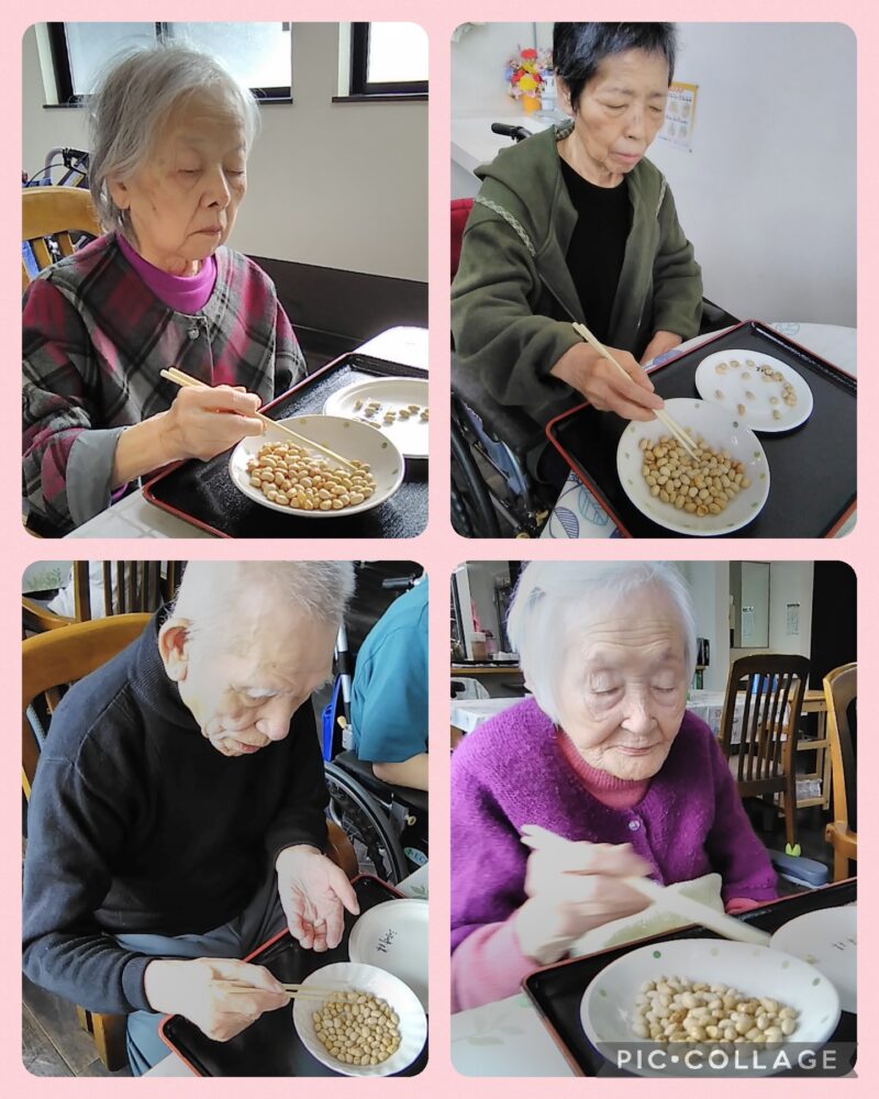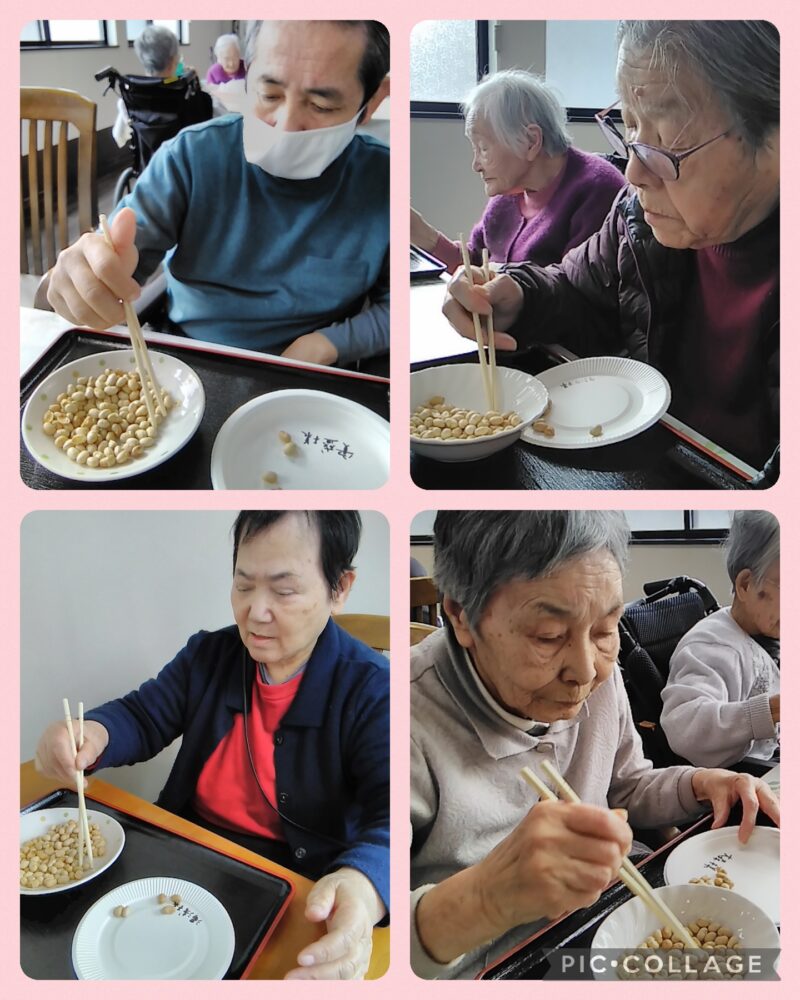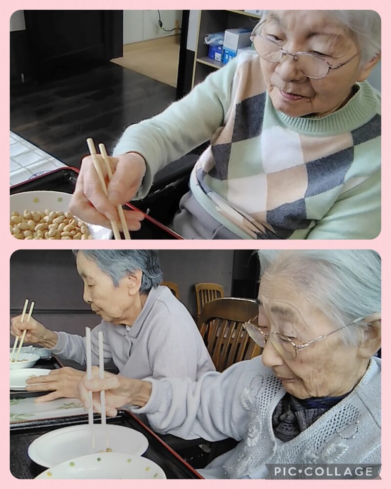 瀬戸内では、趣向を凝らし豆まきならぬ、豆つかみゲームをしました