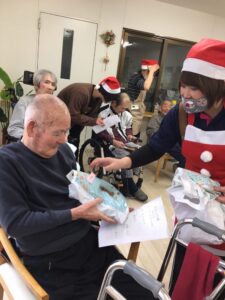 会の最後に職員サンタが皆さんにプレゼントを渡し、そのあとケーキを食べました。