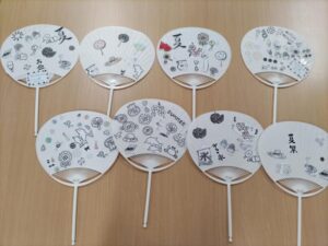 真っ白なうちわに夏らしい絵やシールを貼ったり