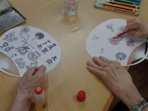 真っ白なうちわに夏らしい絵やシールを貼ったり