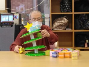 プレゼントをクリスマスツリーに見立てたお皿に乗せるのですが
