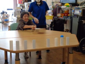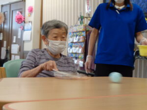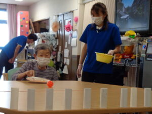 ボールをうちわで扇いでトイレットペーパーの芯を倒します!