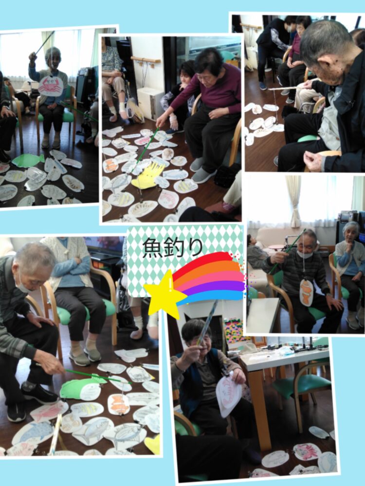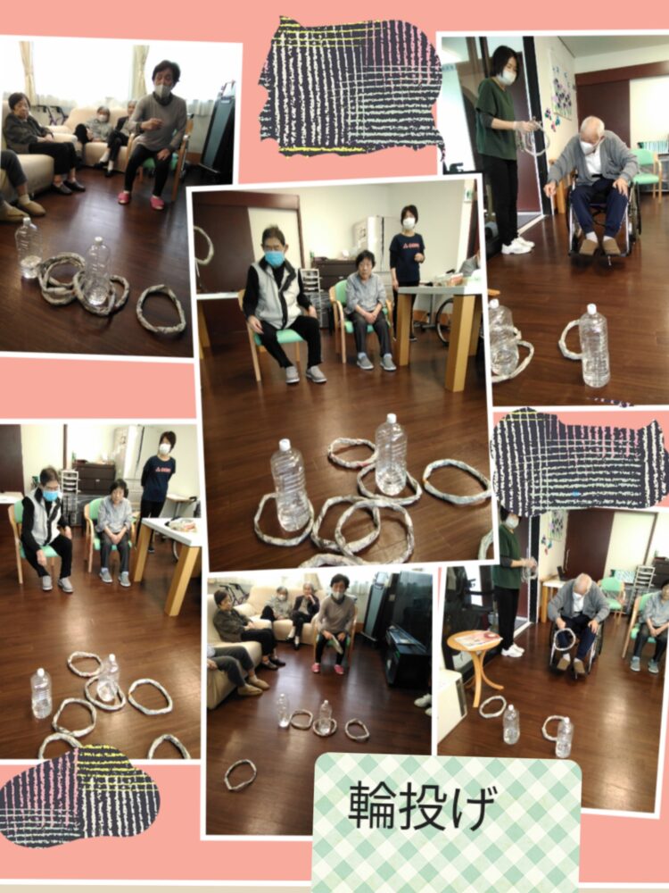 ペットボトルを使い、輪投げです。輪は利用者様とスタッフの共同作業で、新聞紙をねじって輪にしました。