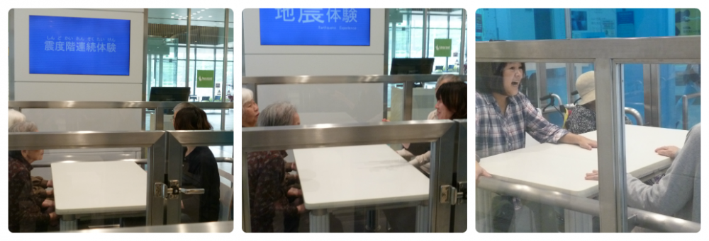 地震体験。利用者様には震度5まで、スタッフは震度7まで体験させていただきました。
