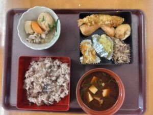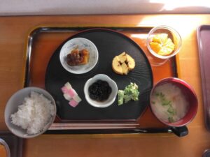 朝はおせち5種盛りと白味噌お雑煮風、お昼はお正月弁当でした♪