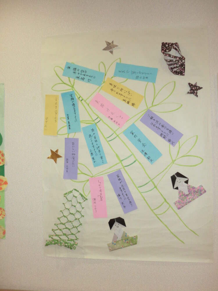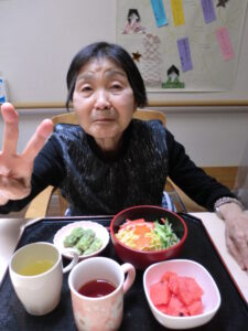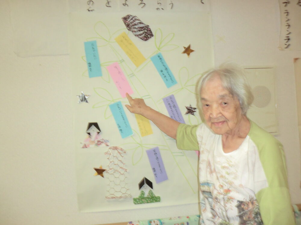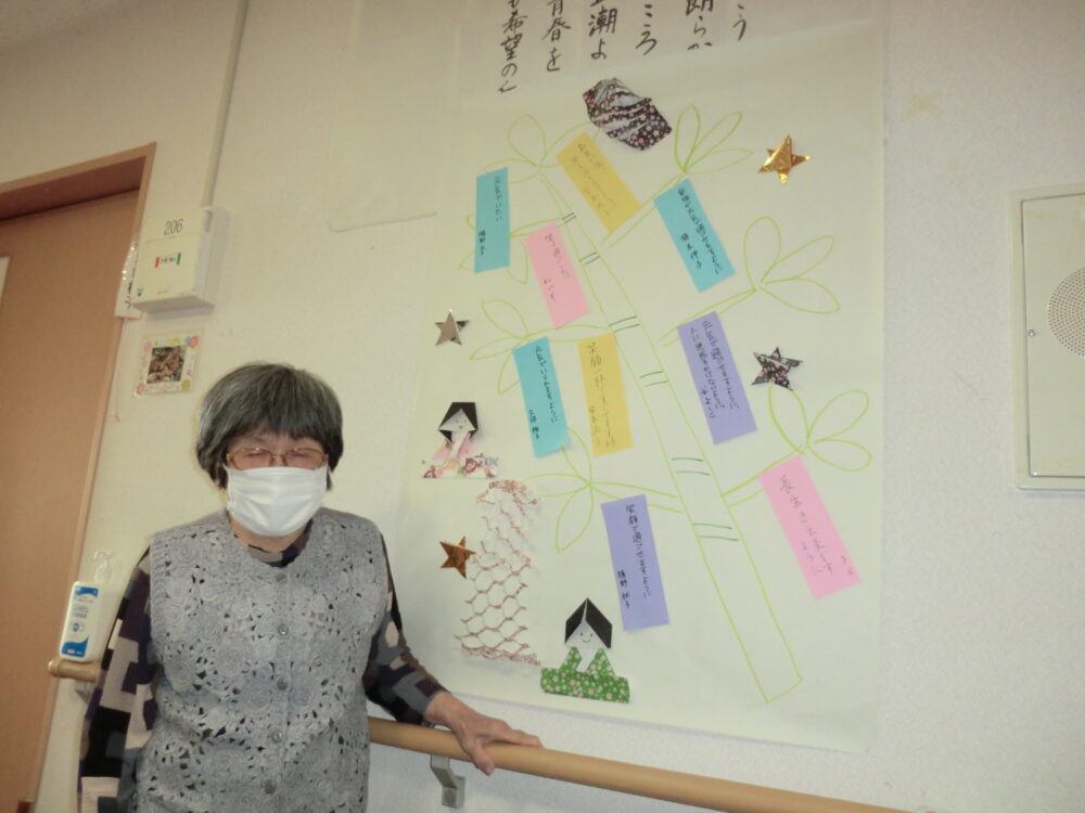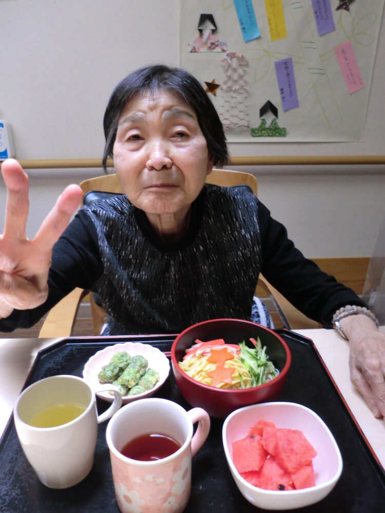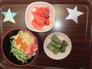 2022.07.07 グループホーム平和苑 ☆七夕☆ 7月7日は七夕ですね(^^♪ 皆様にお願い事を聞き、短冊に 書いていただきました(*’ω’*) 色んなお願いがあり、十人十色で素敵です(^_-)-☆ お昼ご飯はおそうめんとちくわの磯部上げ、すいかです! せっかくの七夕なので人参を星形にしました☆★☆ 皆さましっかりお召し上がりくださいましたm(_ _”m) 暑い日はそうめんや冷たいものが食べやすくていいですね♪ まだまだ暑い夏は続きますが、美味しいものを食べ、 元気に夏を乗り越えましょう(^^)/ 皆様のお願いが叶いますように☆ 一覧ページに戻る