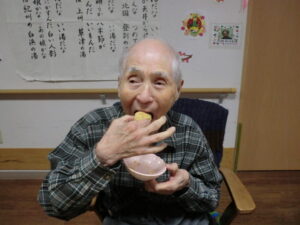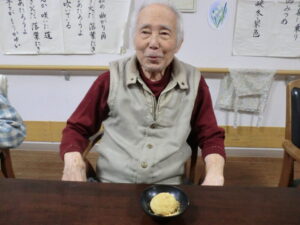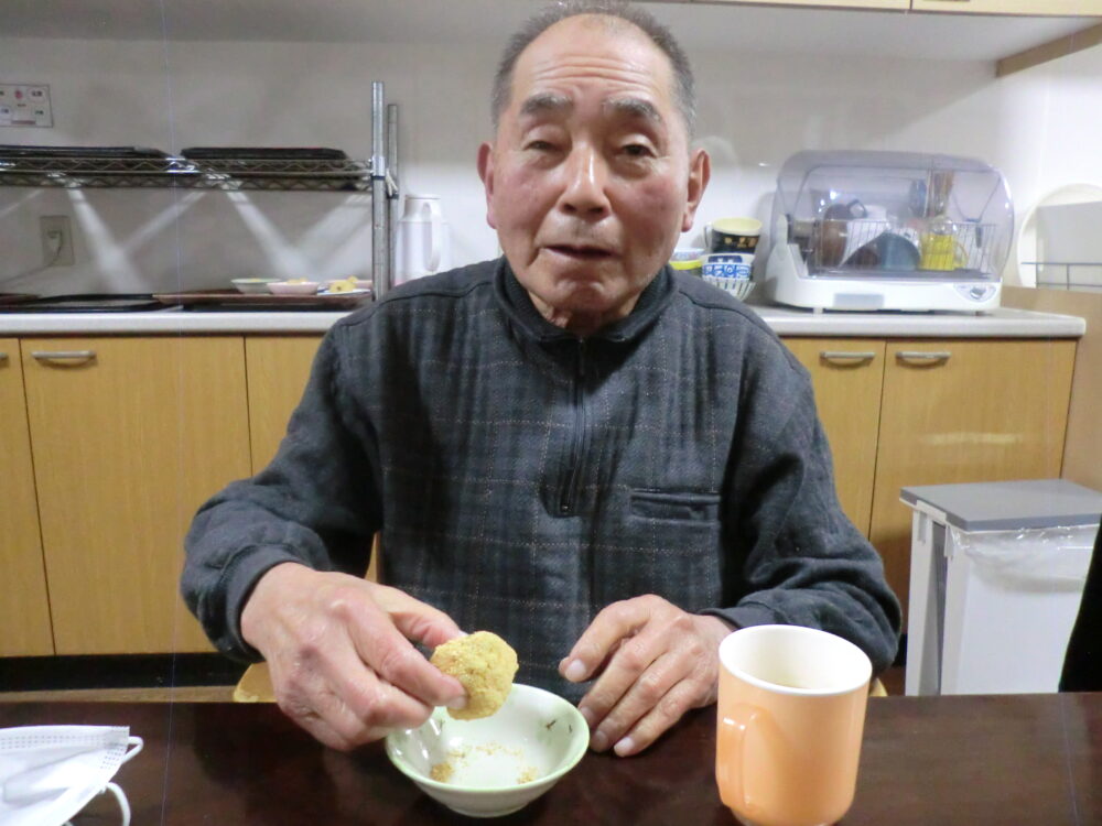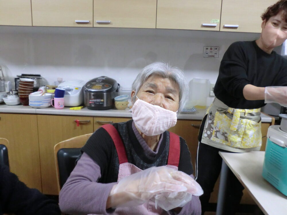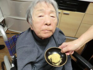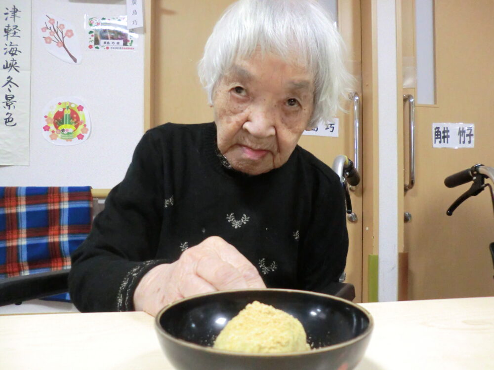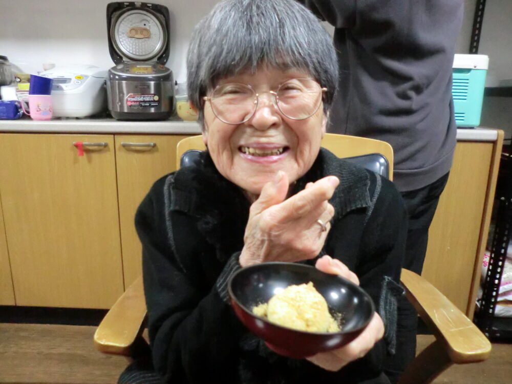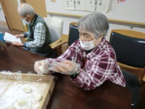 毎年の恒例となった餅つきですがもち米でつくお餅はのどに詰める危険性があるので平和苑では白米と山芋、もち米を少し炊飯器で炊き潰したものを丸めてお雑煮のお餅にしています。