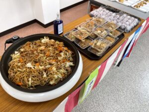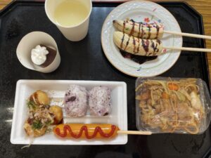 屋台メニューは、焼きそば、たこやき、フランクフルト、おにぎり、チョコバナナ、冷ようかん、ジュース(((o(*゚▽゚*)o)))