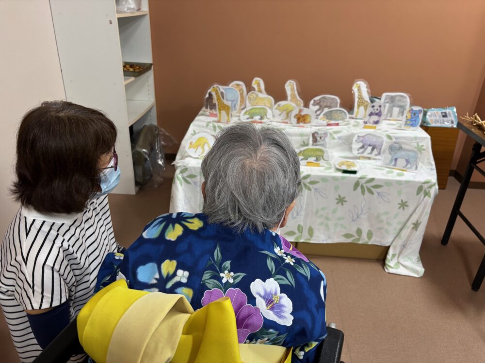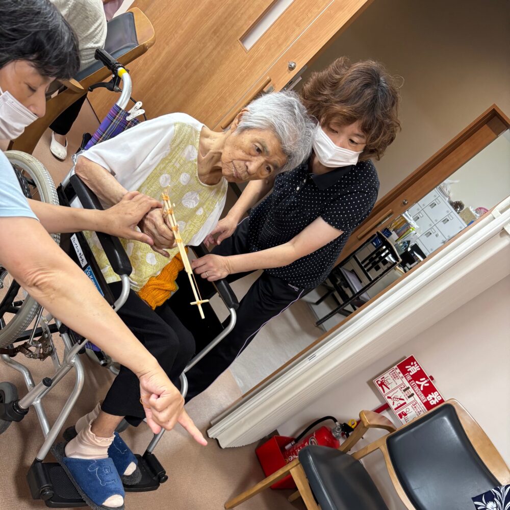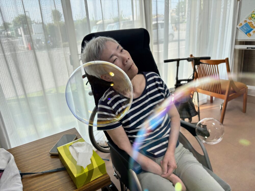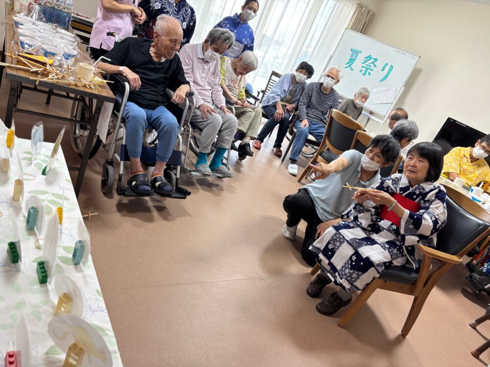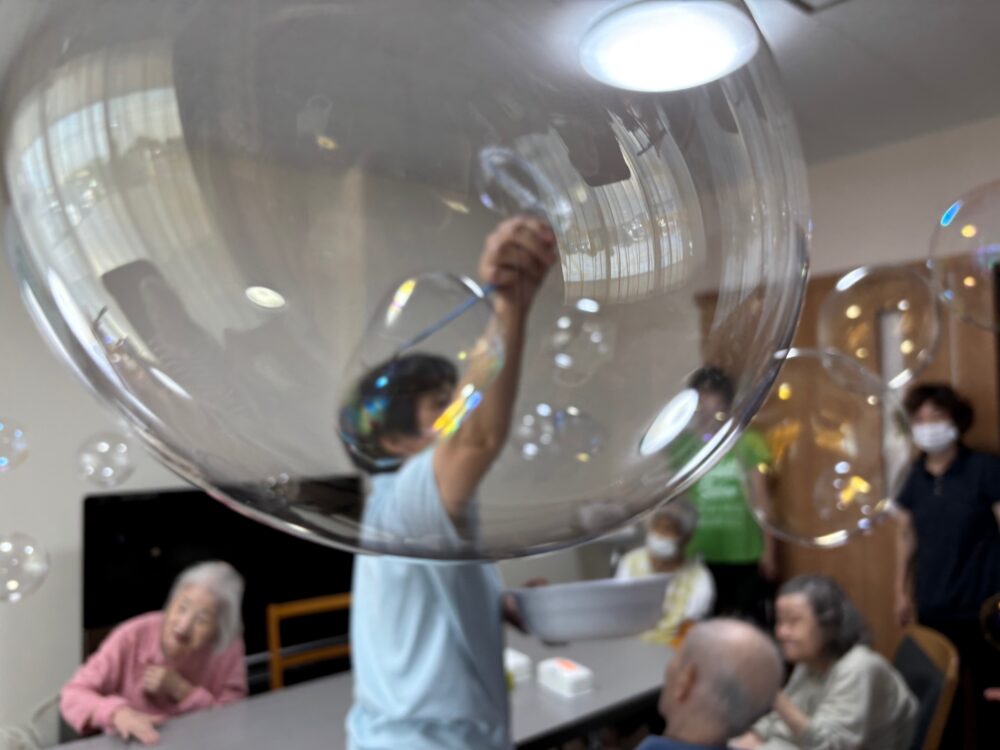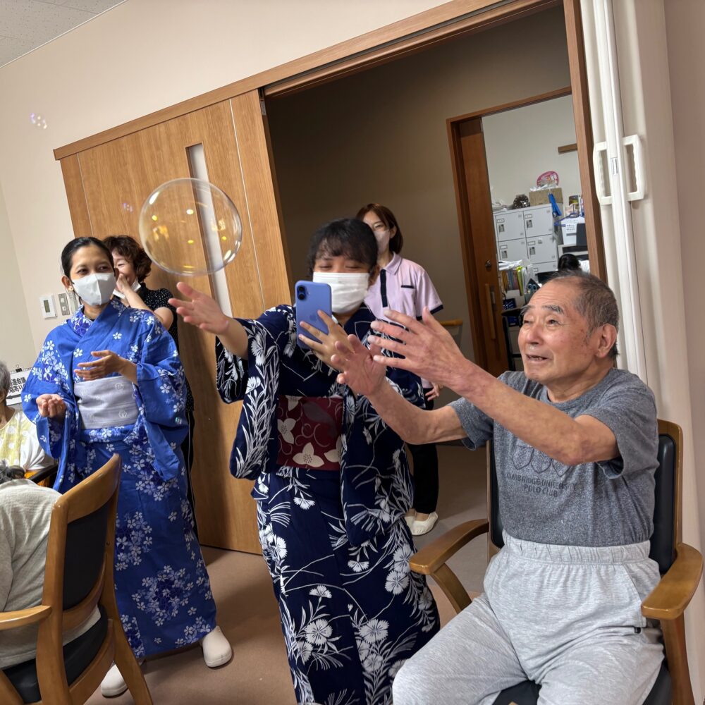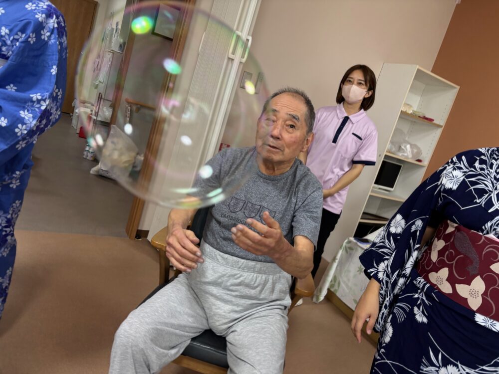 2025.08.18 グループホーム平和苑 夏祭り 🌻8月18日午後より夏祭りイベントを開催しました。職員、入居者様が浴衣を着て雰囲気を楽しみました 🌻 💛屋台メニューは綿菓子・ベビーカステラ・アイスクリーム・チョコバナナ・ノンアルビール・ラムネです💛 🎇輪ゴム鉄砲で射的ゲームをしました。🎇 🍃昔懐かしい巨大シャボン玉です。皆様とても笑顔です。🍃 一覧ページに戻る