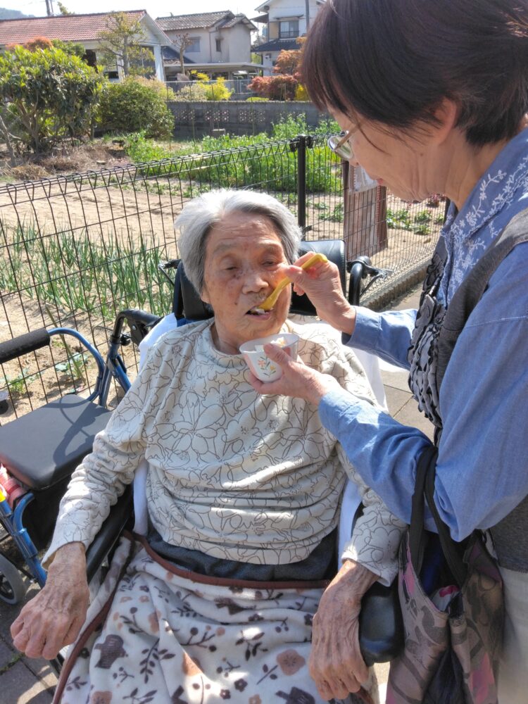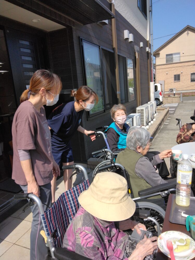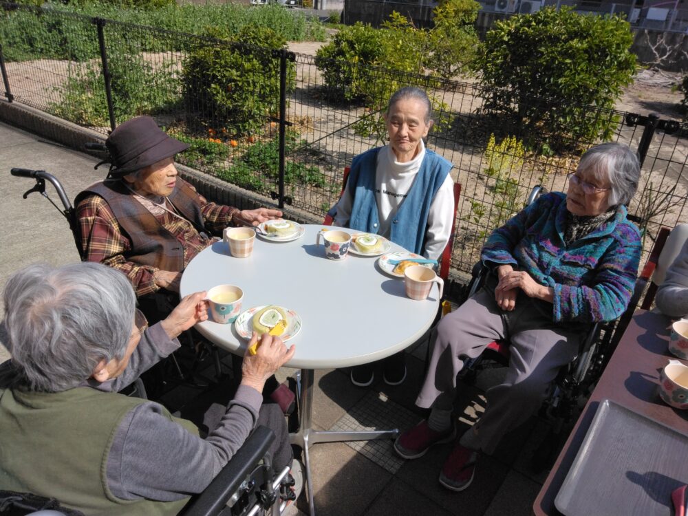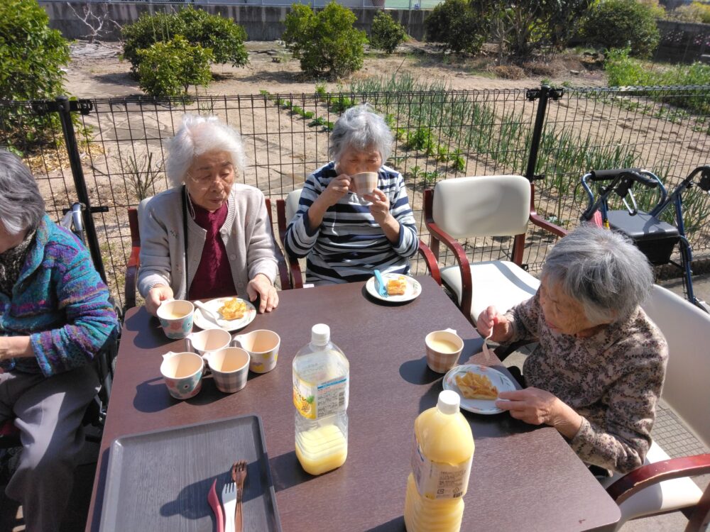 外で花壇の花を見ながらおやつを食べ季節の移り変わりを感じることが出来ました💕