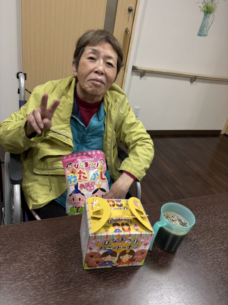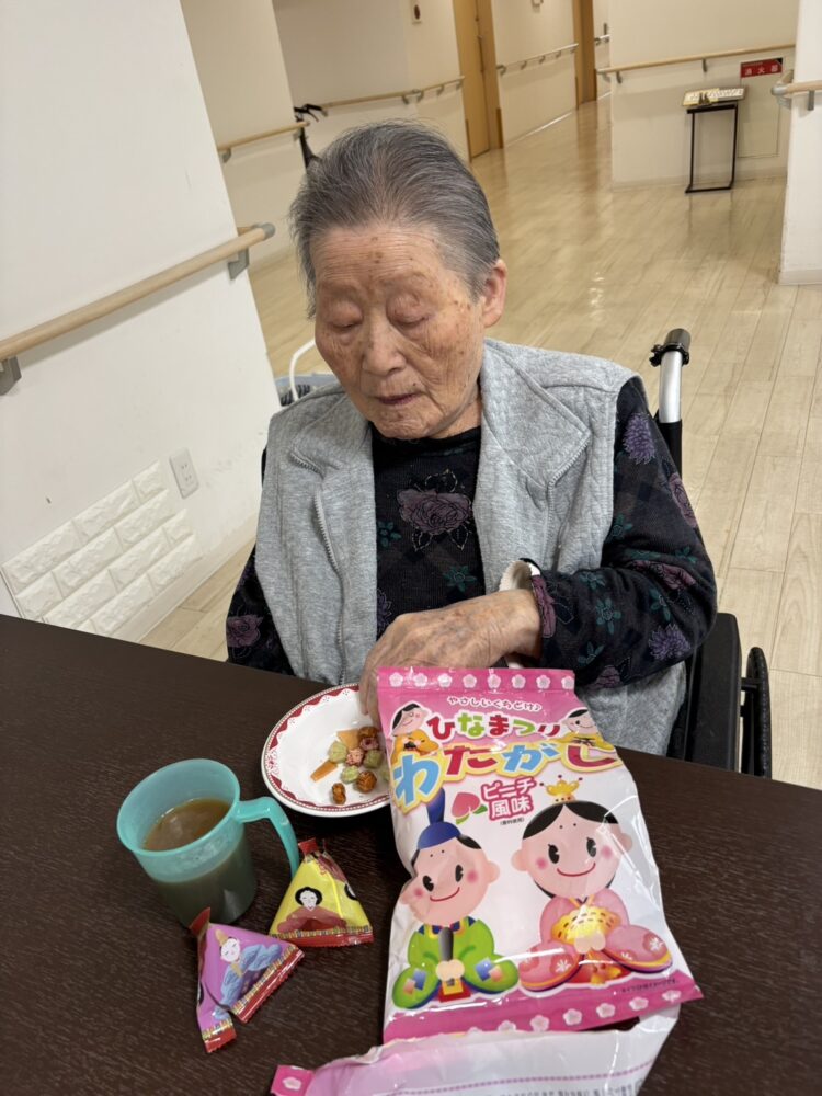 おやつにひなあられ、ド-ナッを食べて楽しまれました。💕💕💕