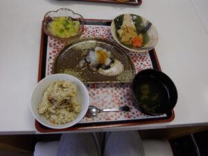 2018.09.25 ハートリンク岩国柱野 敬老会 ささやかながら敬老の日のお祝いをしました 【お祝い膳メニュー】 きのこの炊き込みご飯 さんまの塩焼き がんも煮 おすまし フルーツ・和菓子 昨日は”中秋の名月”でしたね。施設内ではこおろぎの鳴き声が聞こえて、すっかり秋本番です 一覧ページに戻る