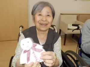 今月は、梅雨を吹き飛ばすぞ‼ということで、 入居者のみなさんと、フェルトを使って、 “てるてる坊主”を作りました( *´艸`) シールを利用して目を付けたり、ペンで顔を描かれたりと、 それぞれ個性のある、てるてる坊主が完成しました!(^^)! 出来上がると、名前をつけられたり、撫でられたり、 入居者のみなさんに気に入って頂けて良かったです(^^♪![]()
