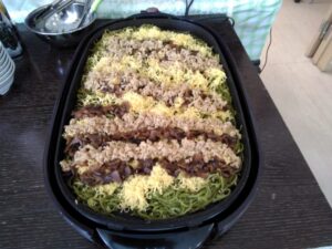 ホットプレートで茶そばを焼きトッピングにシイタケと肉そぼろと錦糸卵が