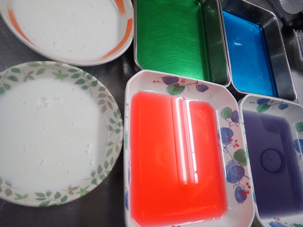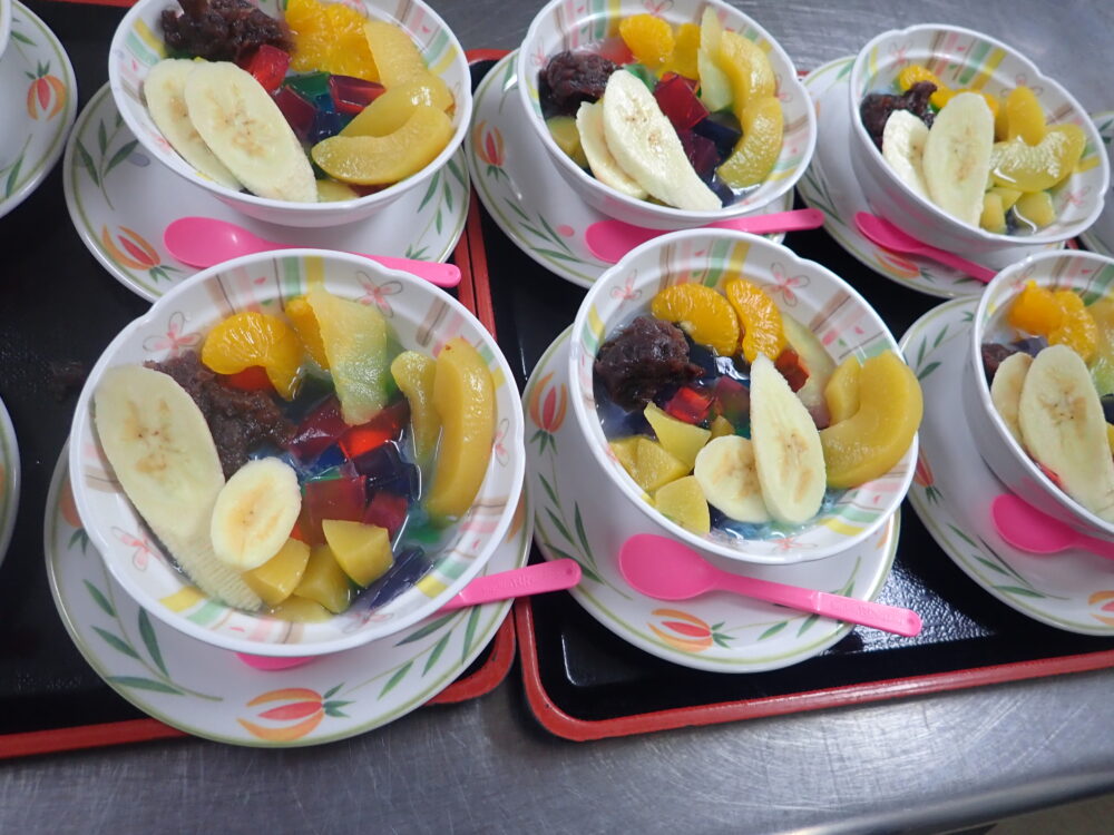 手作り寒天とフルーツ(リンゴ、桃、バナナ、みかん)と