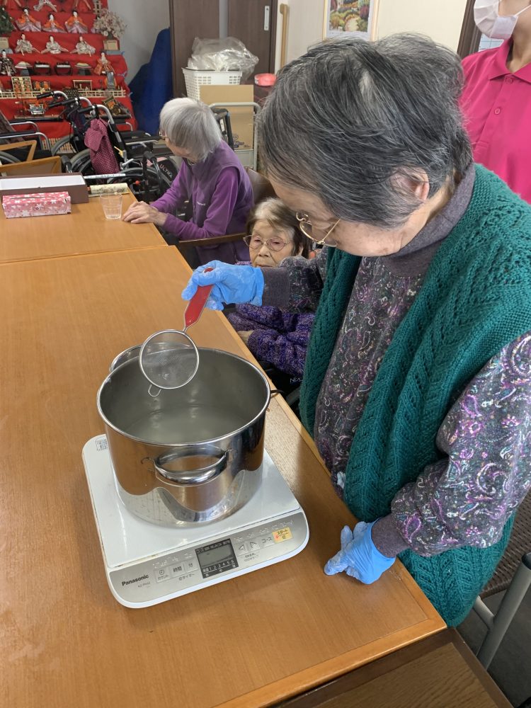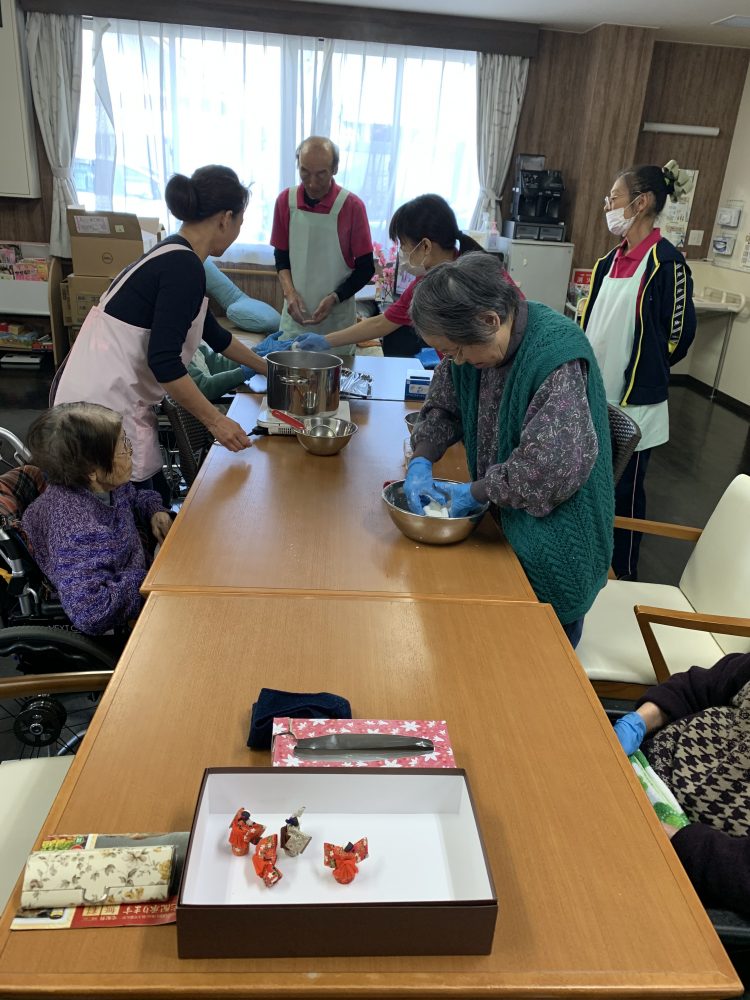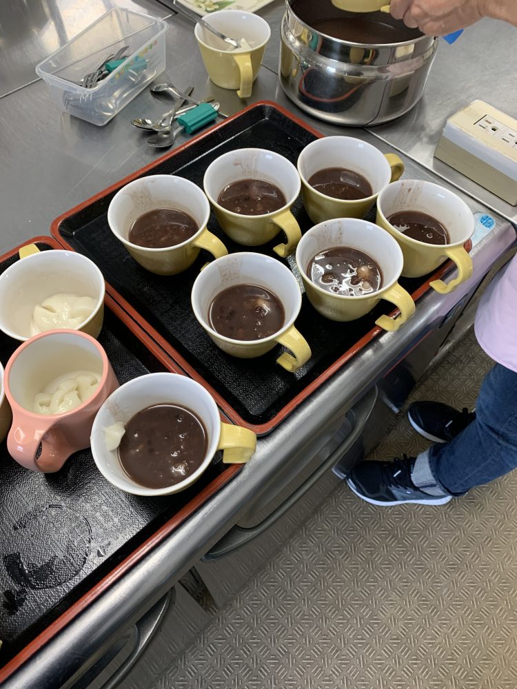 完成しました~白玉ぜんざいの出来上がり~(^_-)-☆入居者様と職員が協力して作るおやつは本当に全員が喜んでいました。各々、「美味しいもう一杯欲しい」等、笑顔がまた見れたおやつの談笑のひと時でした。職員もこの時間を共有することで信頼関係が構築できるのだと私は思っています。なぜなら介護は一人ではできず、チームで行うものであるからと私は思います。明日も明後日も一つの笑顔の為に自分たちが楽しいと思えるイベントを継続したいと思います( ^^) _U~~
