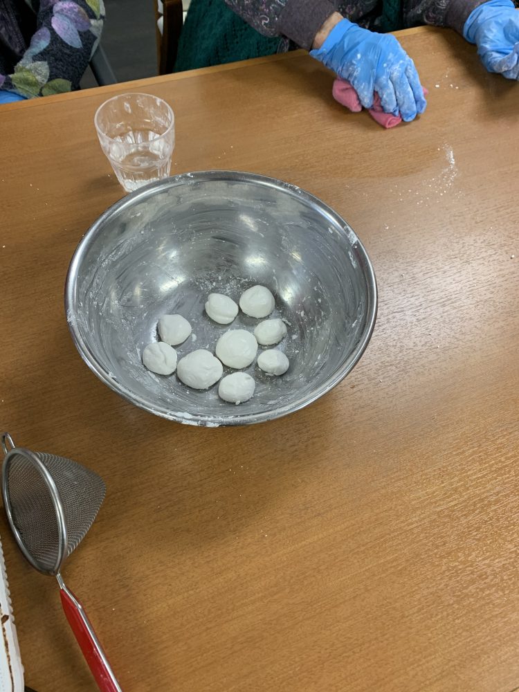 それでは白玉を作ります(^^)/入居者様にお手伝いをしてもらいます。H様がこねている様子をU様がじっと見つめていますね。