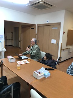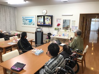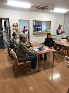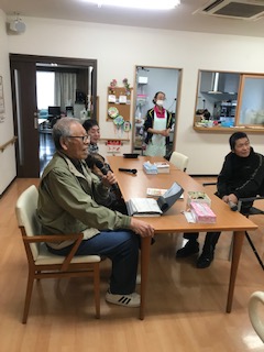 ギャラリーは少ないですが歌が好きな人は自然と聞いています。厨房からも職員が合いの手を入れながら笑顔が見えていました(^^)/