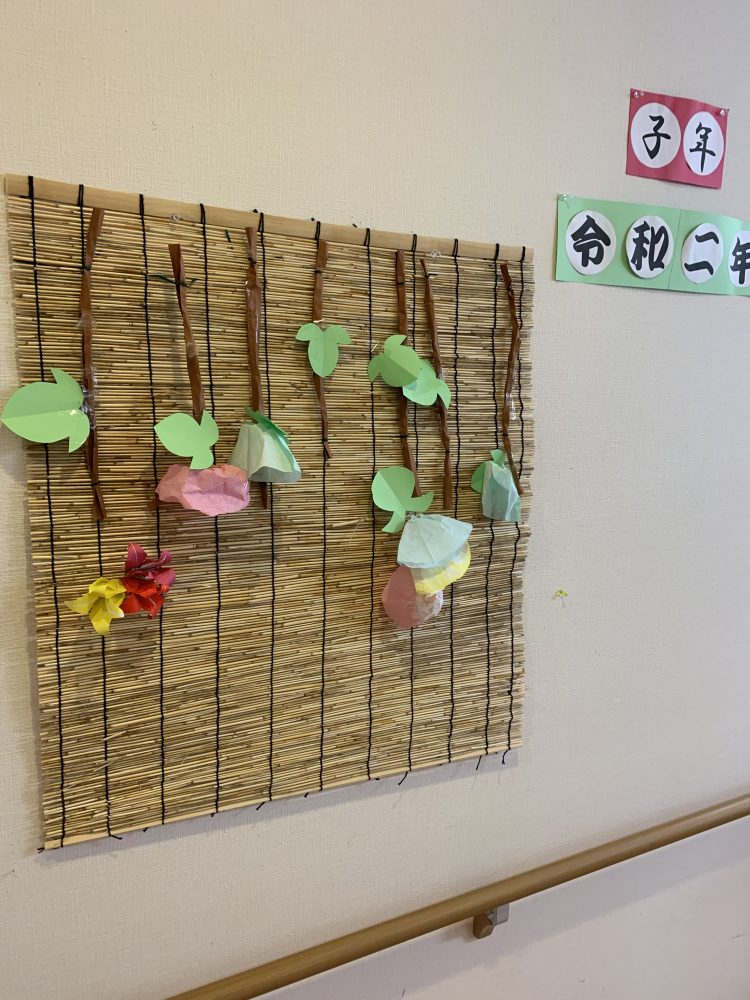 入居者様が頑張って折り紙で作成した「朝顔の飾り」を玄関に飾りました~”(-“”-)”