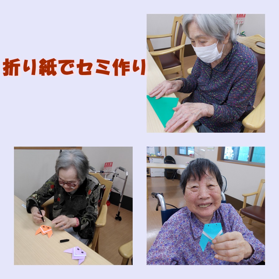 ひまわりはペーパーフラワーにフェルトを使い、セミを折り紙で作りました🐜