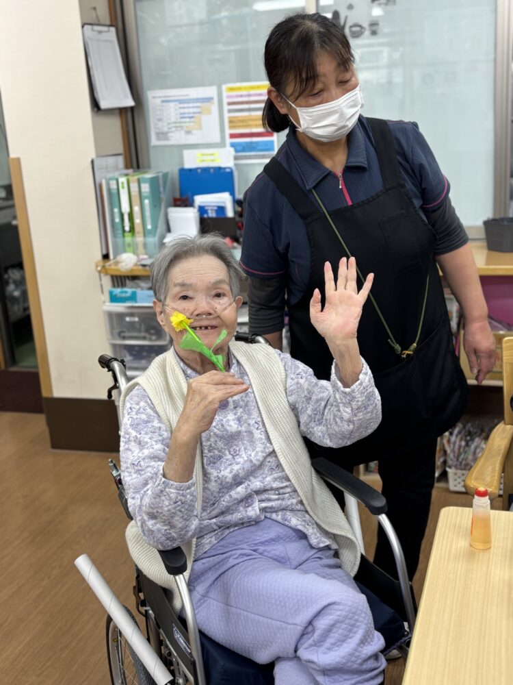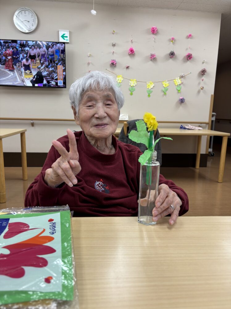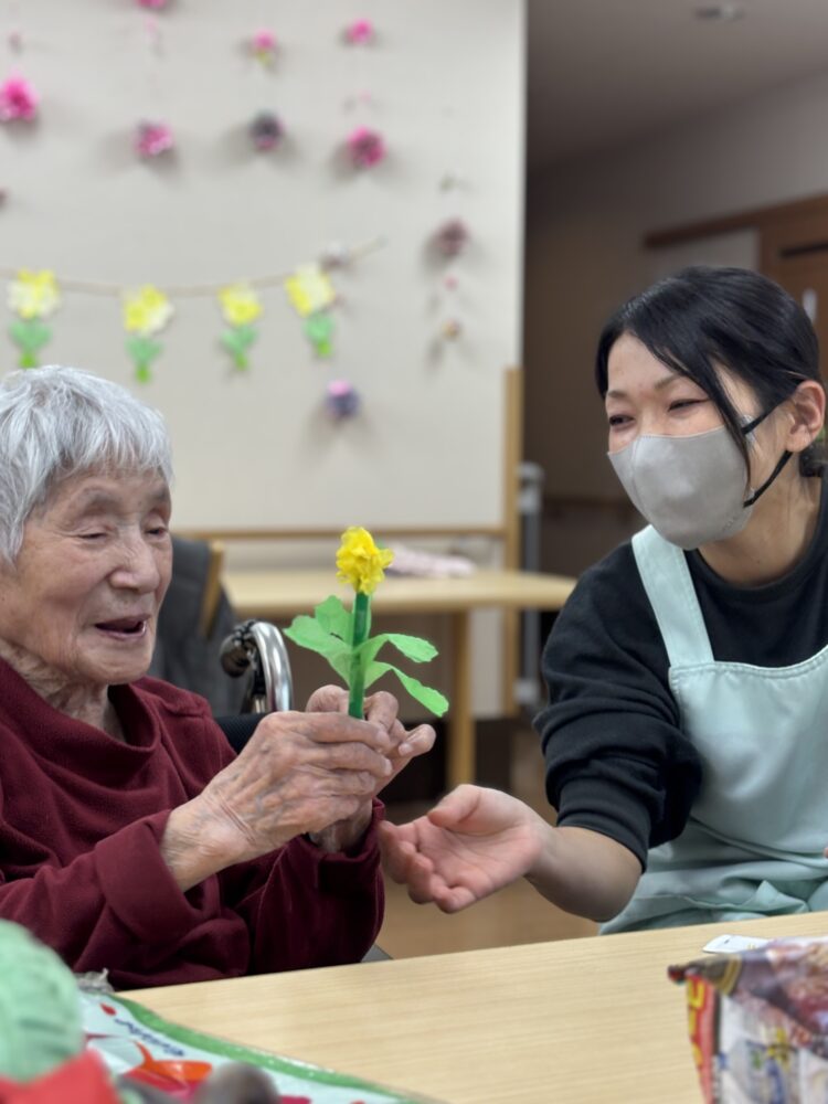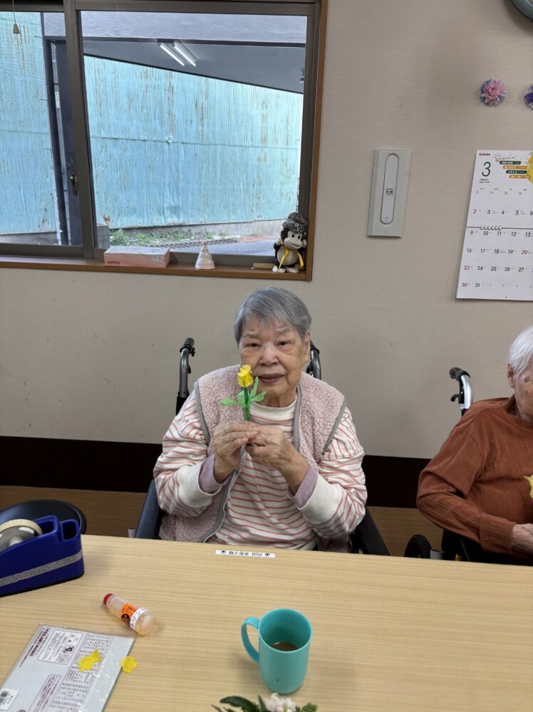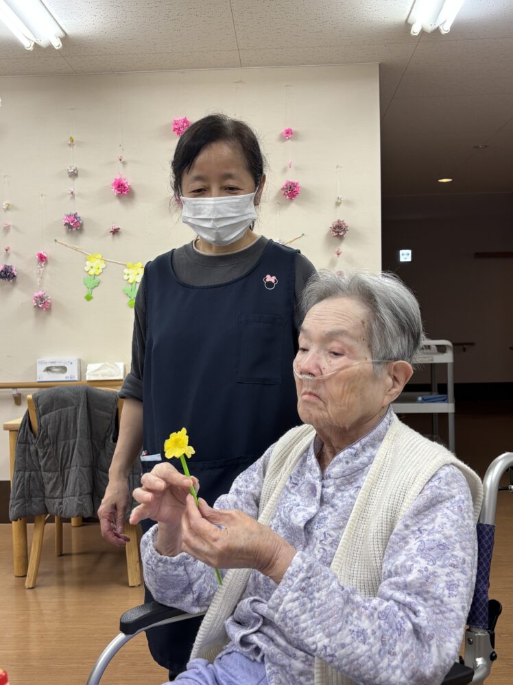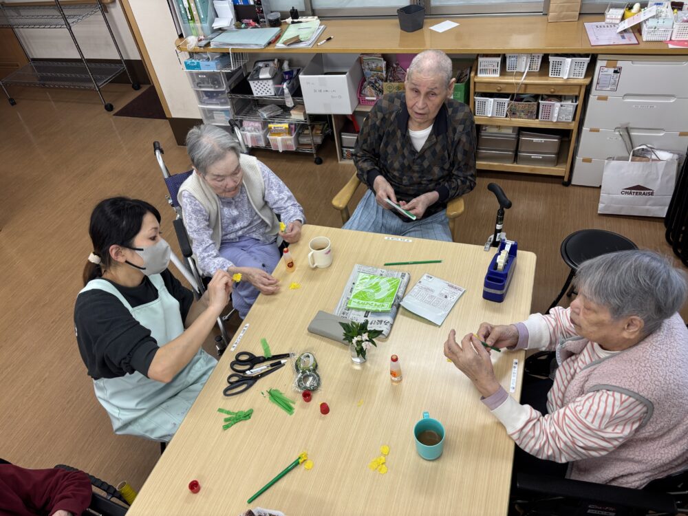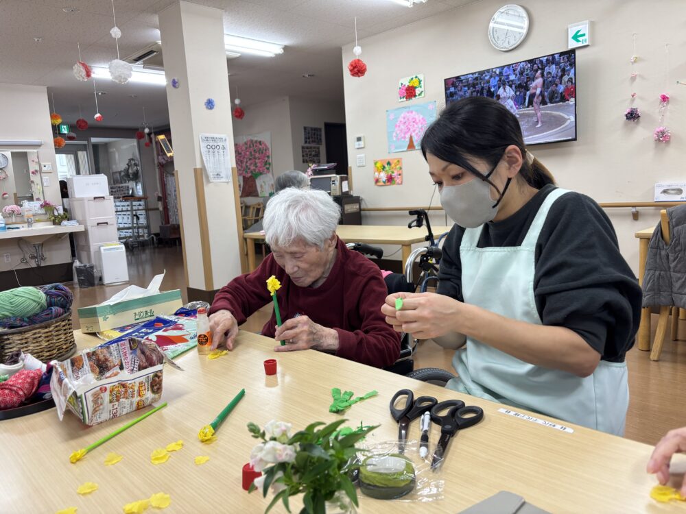 男性の利用者様が茎部分を折り紙で丸め、女性の利用者様がお花をつけてます!