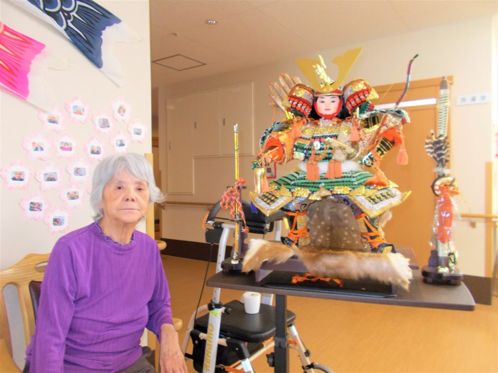 男の子のお祝いに女性が立派な兜の前でパチリ
