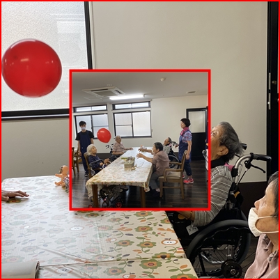 上肢の運動も兼ね風船バレー🎈数を数えて1・2・3・…..99・100までいきました‼