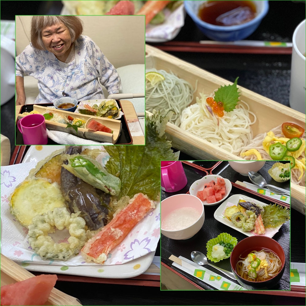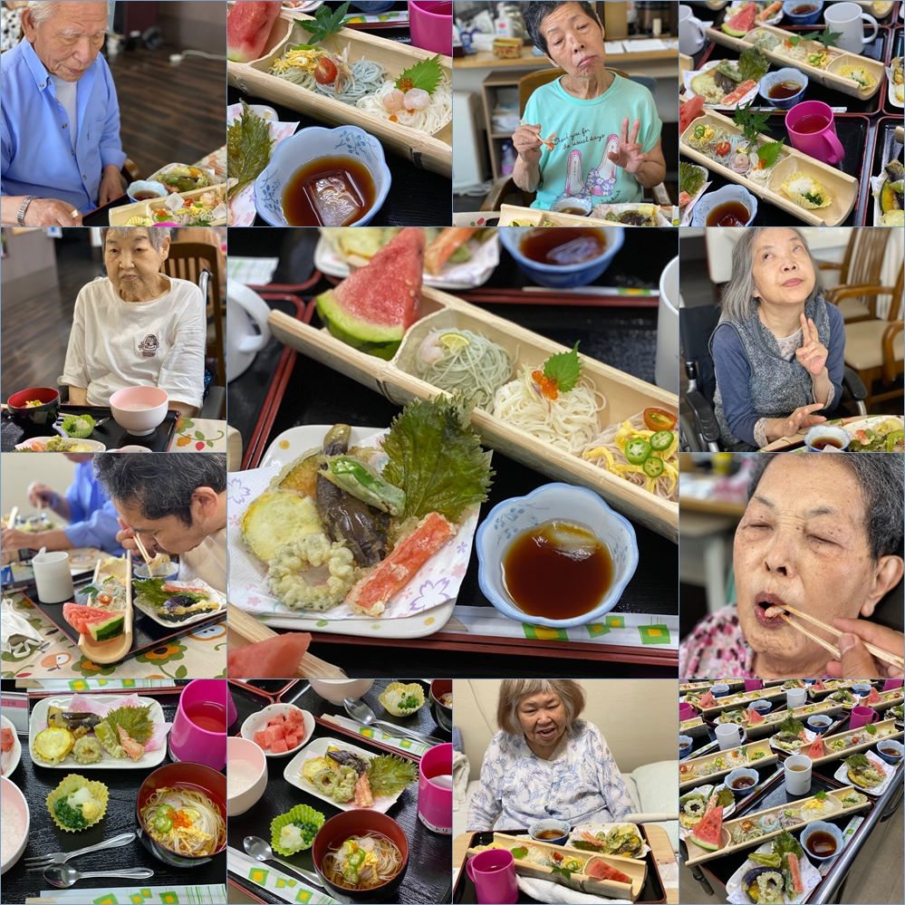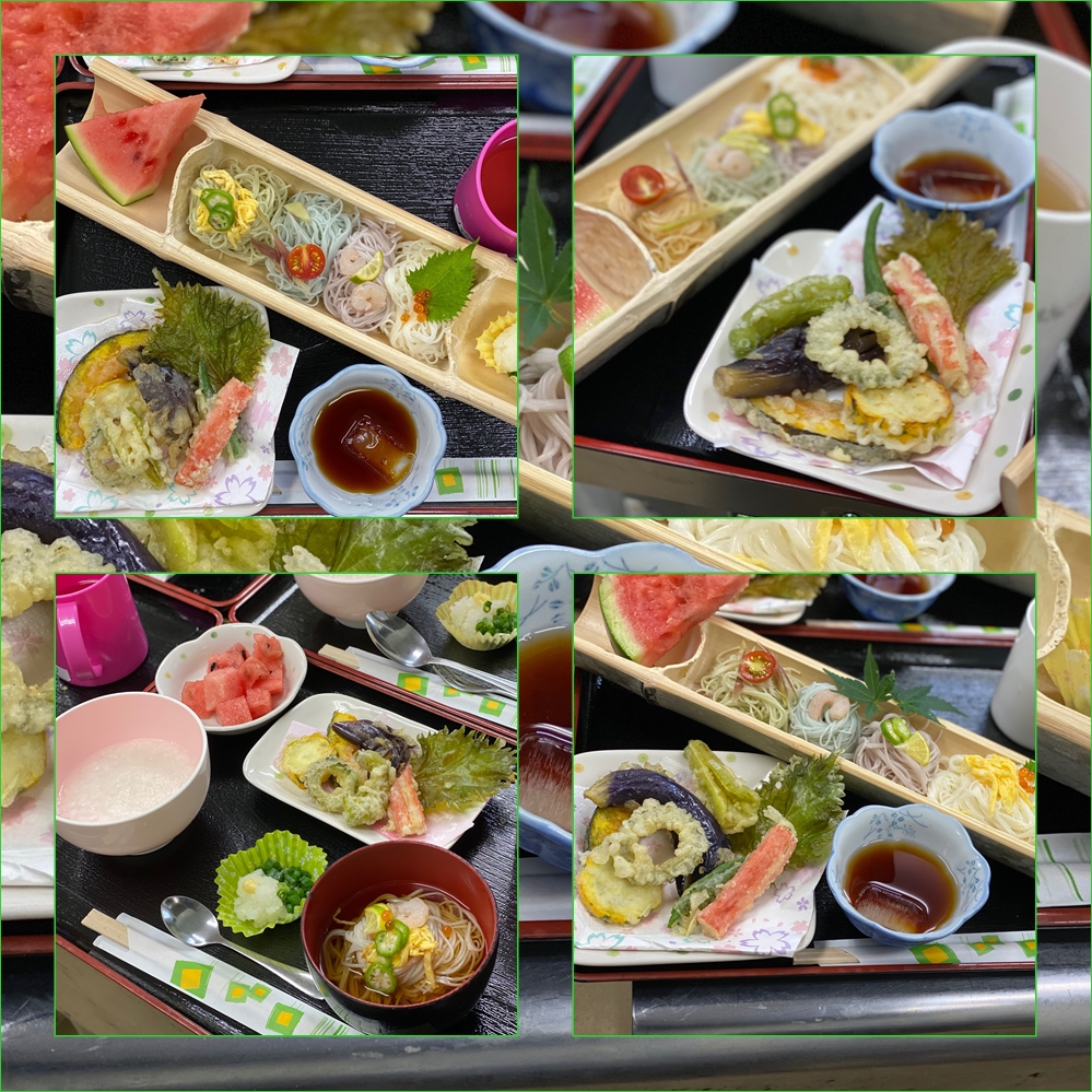 感染予防の為、今年はお一人づつのご提供になりましたが、地元で採れた夏野菜と8色のそーめんを使って目で見ても楽しめるように工夫しました( ´∀` )味も美味しいと評判です(〃艸〃)ムフッ